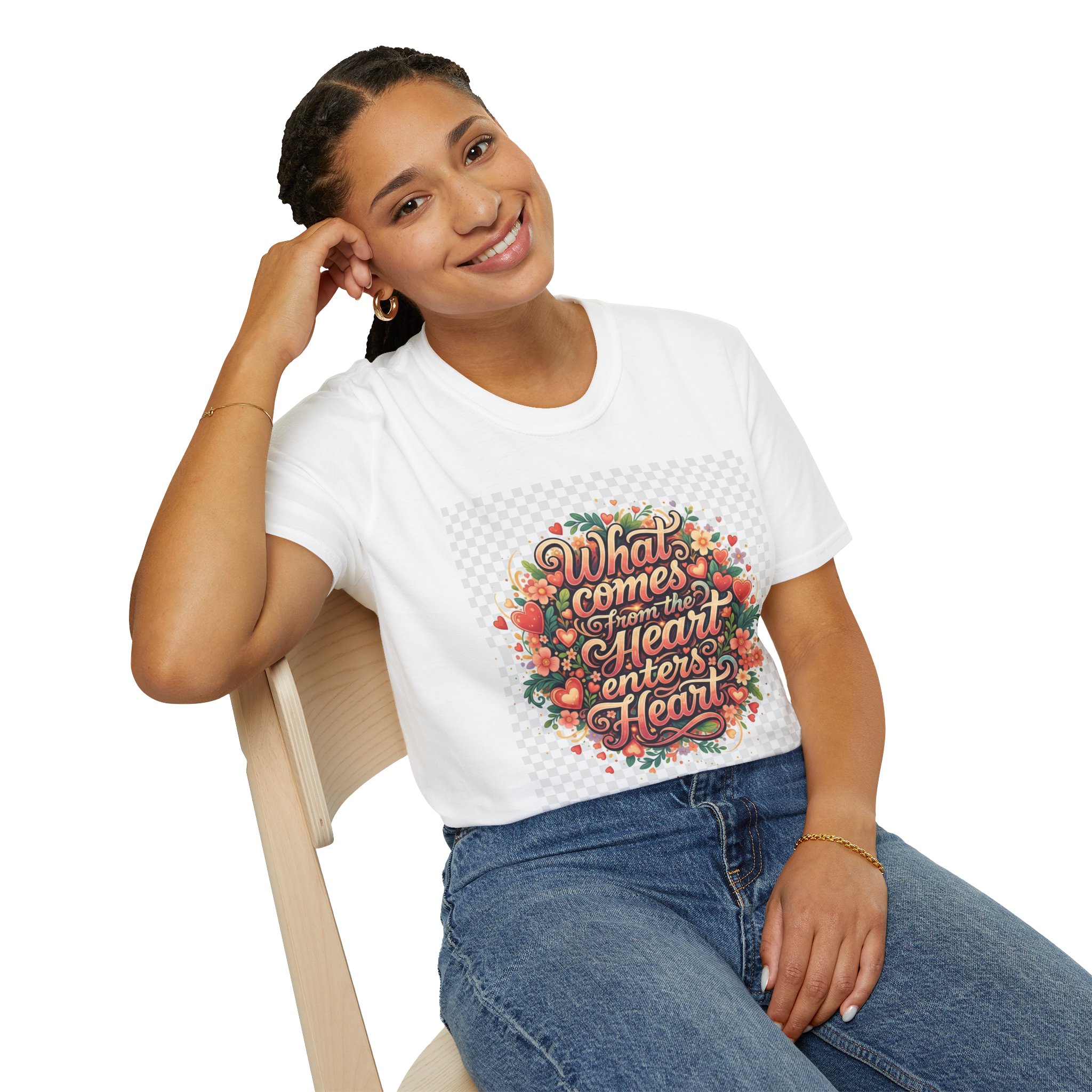 Soft, breathable cotton and a hand-lettered floral design come together in a tee that feels like a warm note from a friend. The round, vintage-inspired lettering reads “What comes from the heart enters heart,” surrounded by roses and foliage in a soft, warm palette. Wear it on slow mornings with coffee, layer it under a cardigan for a walk through the neighborhood, or bring it to a small gathering where gentle, sincere style matters. The lightweight knit drapes easily and holds its shape, so the message stays readable wash after wash. This shirt is for people who prefer quiet, thoughtful style—clothing that speaks softly but stays with you.